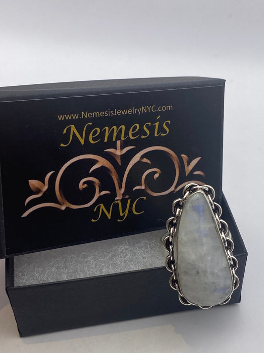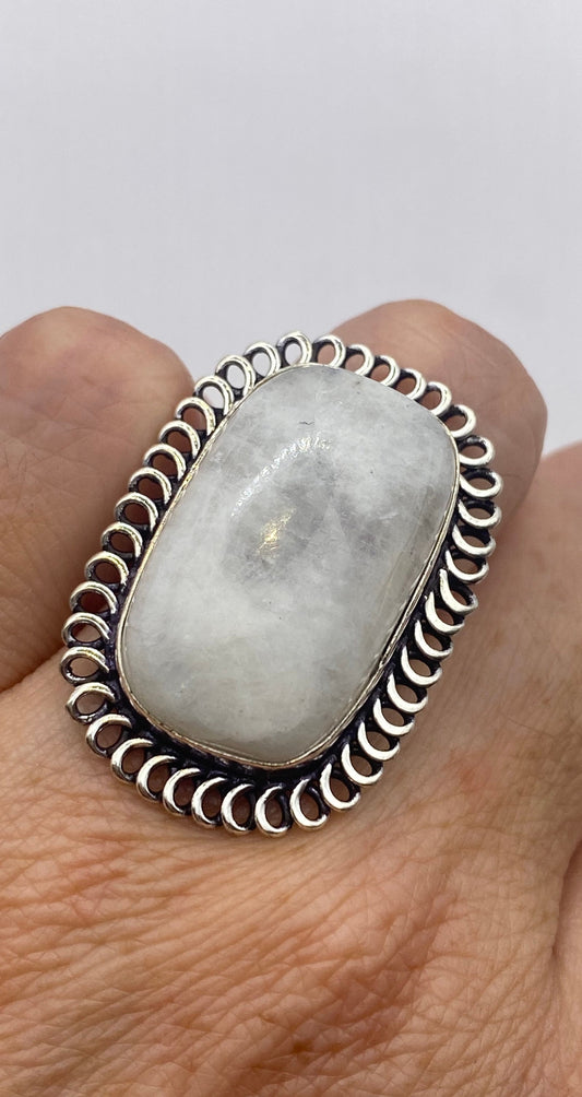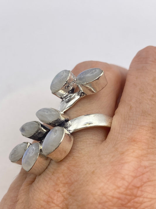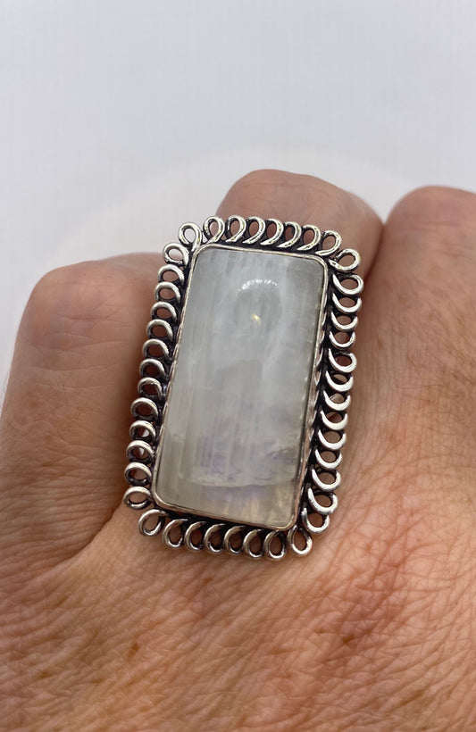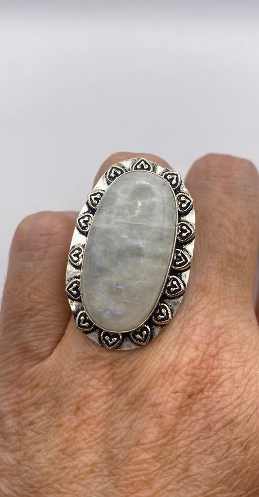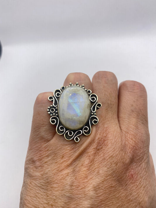 Vintage Large Blue White Rainbow Moonstone Stone Silver Ring Adjustable