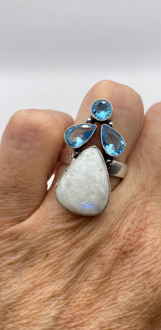 Vintage Large Blue White Rainbow Moonstone Blue Topaz Silver Ring Adjustable