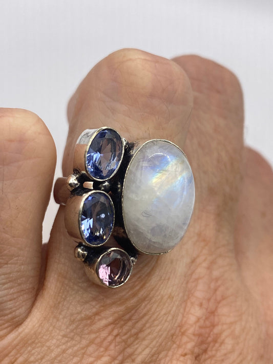 Vintage Large Blue White Rainbow Moonstone Blue Topaz Amethyst Silver Ring Adjustable