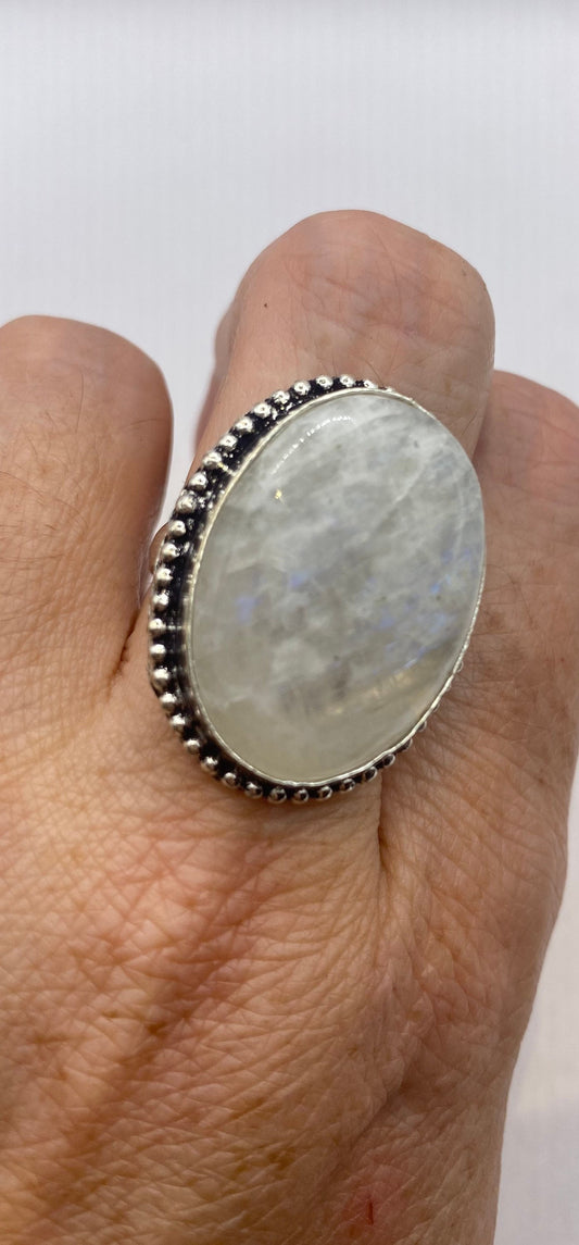 Vintage Large Blue White Rainbow Moonstone Stone Silver Ring