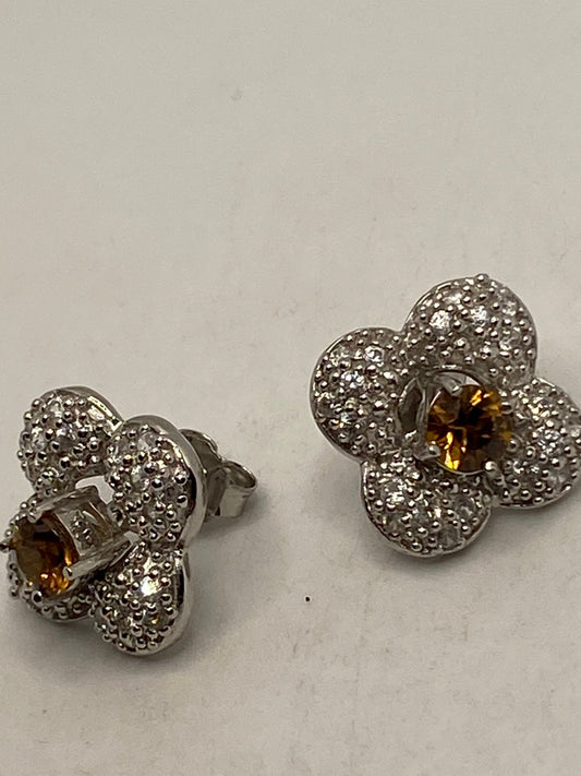 Vintage Genuine Citrine Gemstone 925 Sterling Silver Flower Stud Earrings