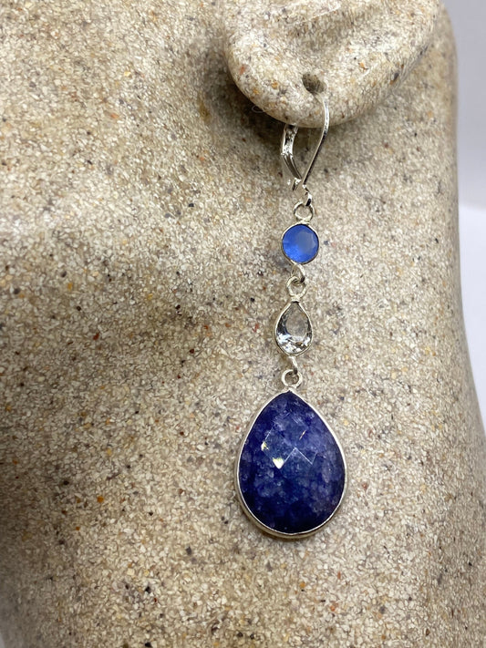 Vintage Blue Raw Sapphire Sterling Silver Lever Back Chandelier Earrings