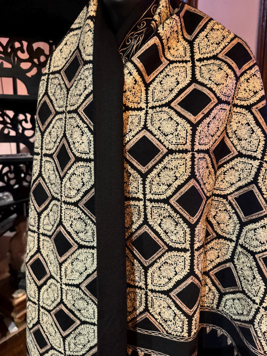 Vintage Black Cashmere Pashmina Scarf Wrap Paisley Embroidered