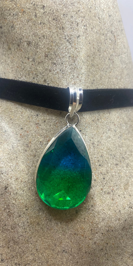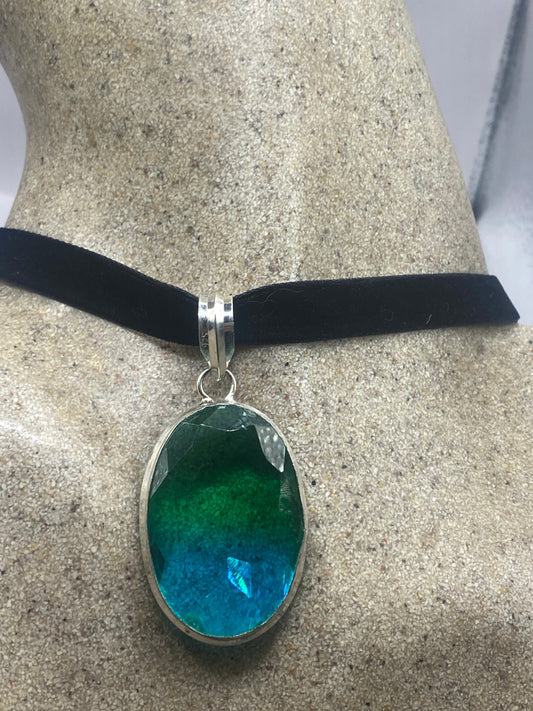 Blue Green Handmade Gothic Silver Finished Genuine Facetted Antique Volcanic Glass Choker Necklace