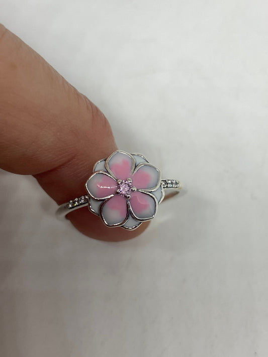 Brooklyn Line Micro Cubic Zirconia Crystal Pink Enamel Flower Sterling Silver Band Ring