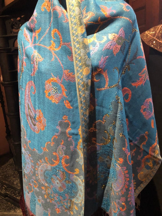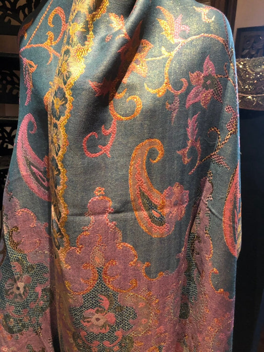 Golden Vintage Blue Green Gold Metallic Paisley Brocade Pashmina Scarf Wrap
