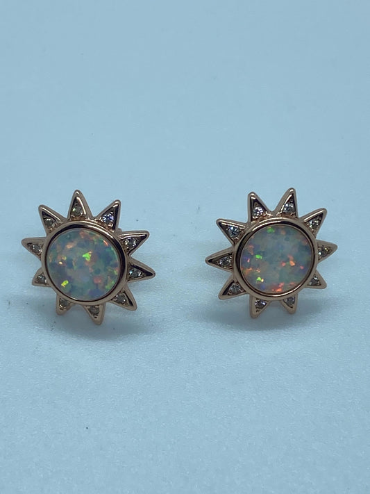 Vintage White Opal Sun Earrings Rose Golden 925 Sterling Silver Stud Button