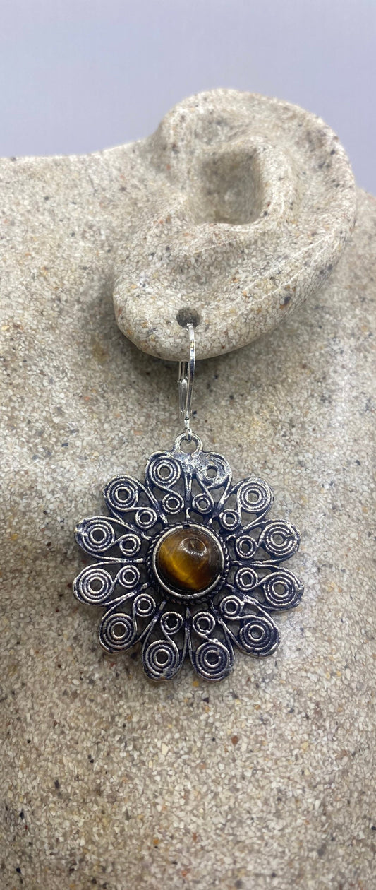 Vintage Tigers Eye Dangle Earrings 925 Sterling Silver Lever Backs