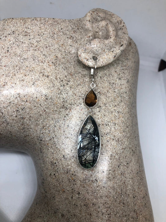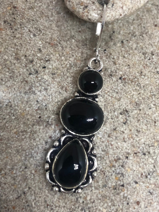 Antique Vintage Faux Black Rutile Glass Silver Dangle Earrings