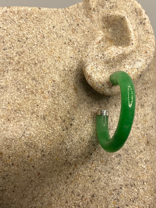 Vintage Green Jade Sterling Silver Semi Hoop Earrings