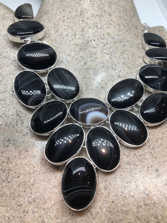 Vintage Black Agate 925 Sterling Silver Necklace Choker