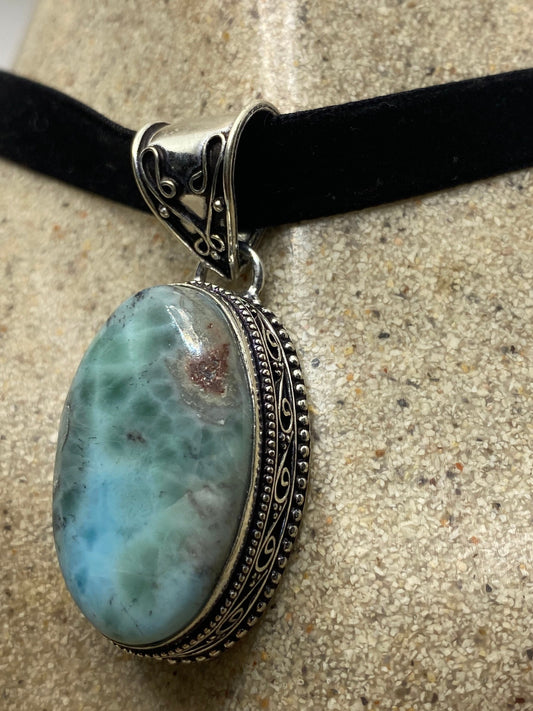 Vintage Blue Larimar Black Velvet Ribbon Choker Necklace