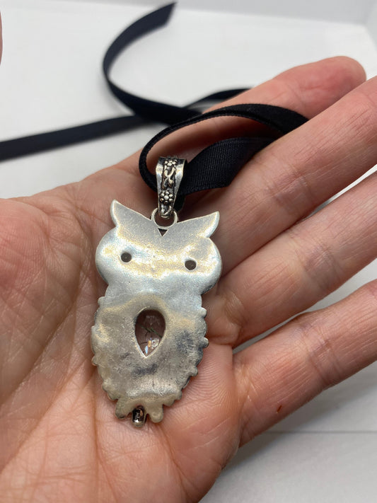 Vintage Silver Genuine Clear Quartz Owl Choker Black Velvet Necklace.