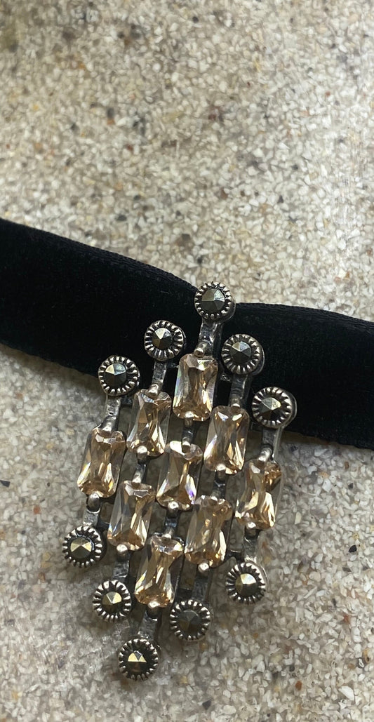 Vintage Amber Crystal Marcasite 925 Sterling Silver Pendant Necklace