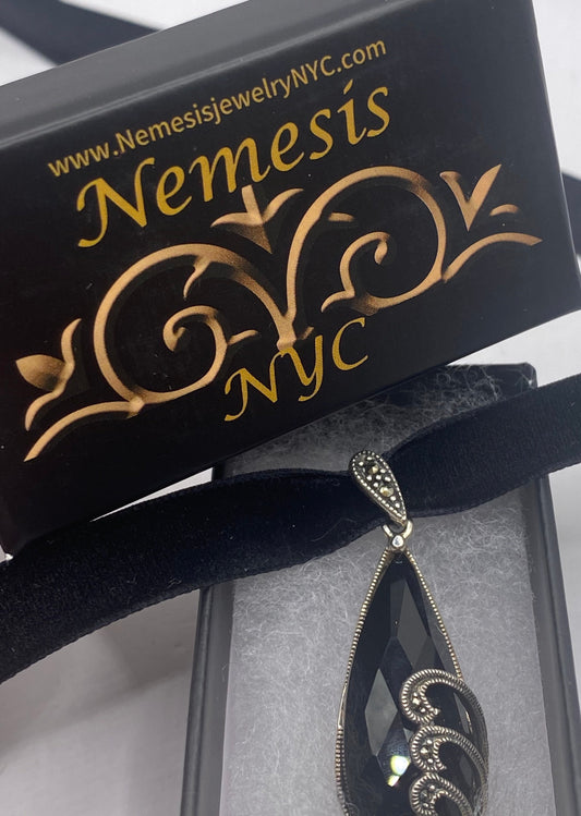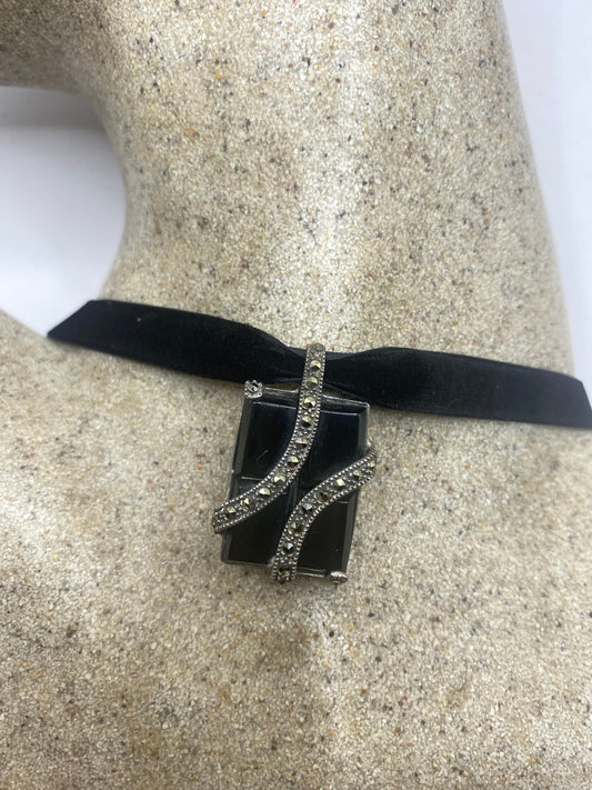 Vintage Marcasite Choker 925 Sterling Silver Black Onyx Pendant Necklace