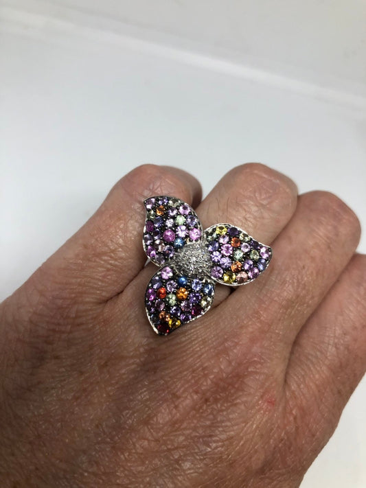 Vintage Pink and Mixed color Tourmaline 925 Sterling Silver Flower Ring