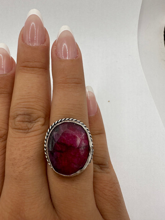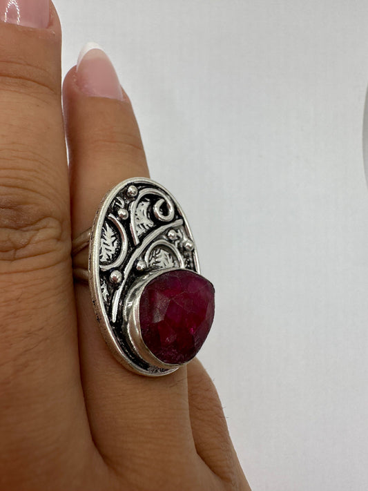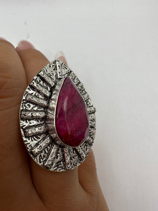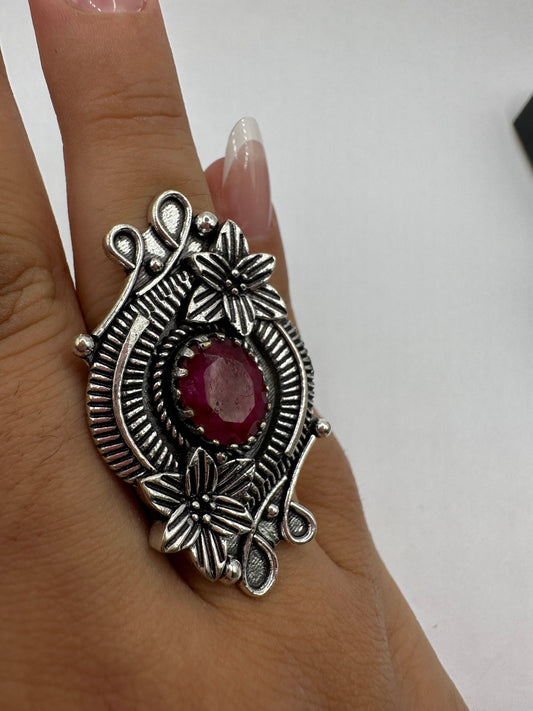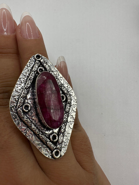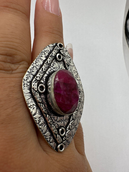 Vintage Raw Pink Ruby Silver Chunky Boho Ring