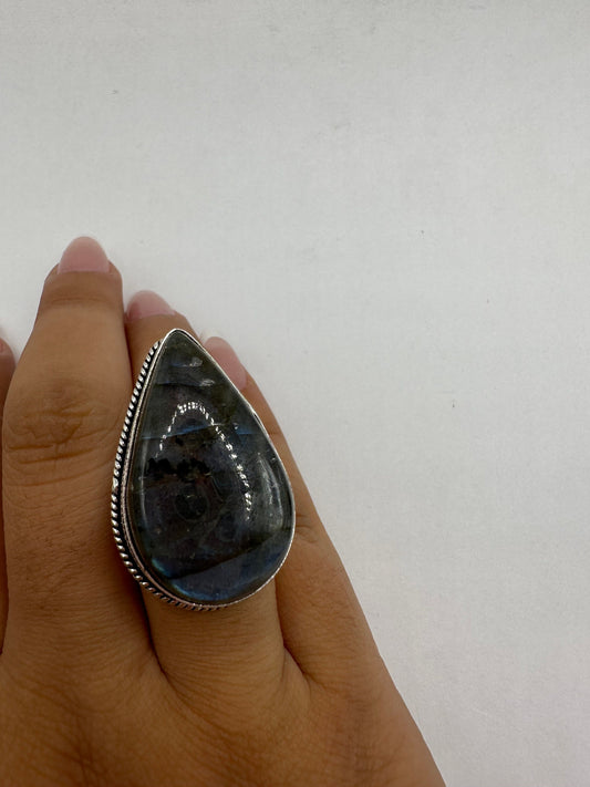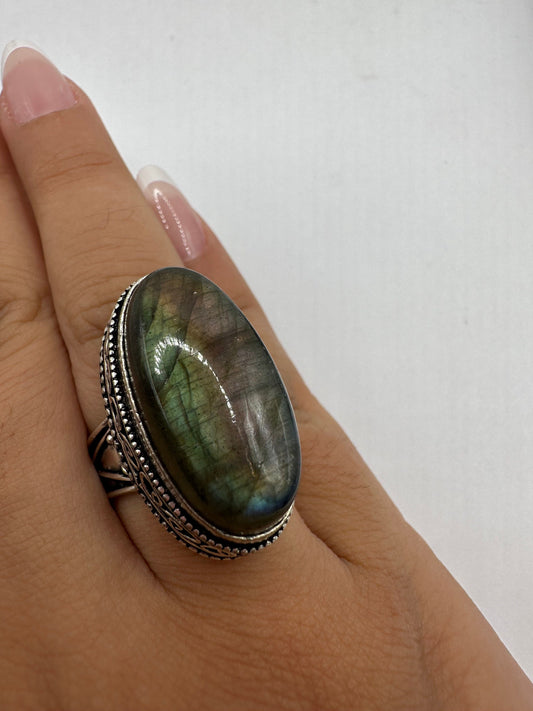 Vintage Large Labradorite Rainbow Moonstone Stone Silver Ring
