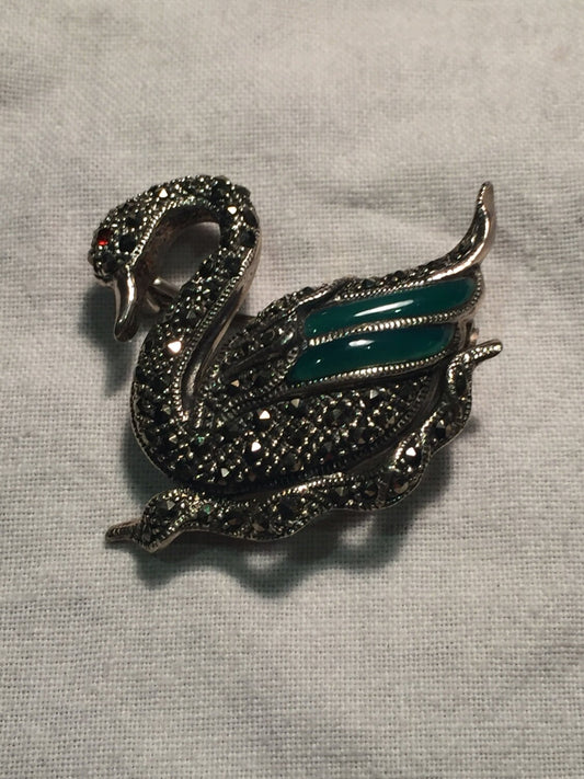 Vintage Handmade Genuine Marcasite 925 Sterling Silver Swan Brooch