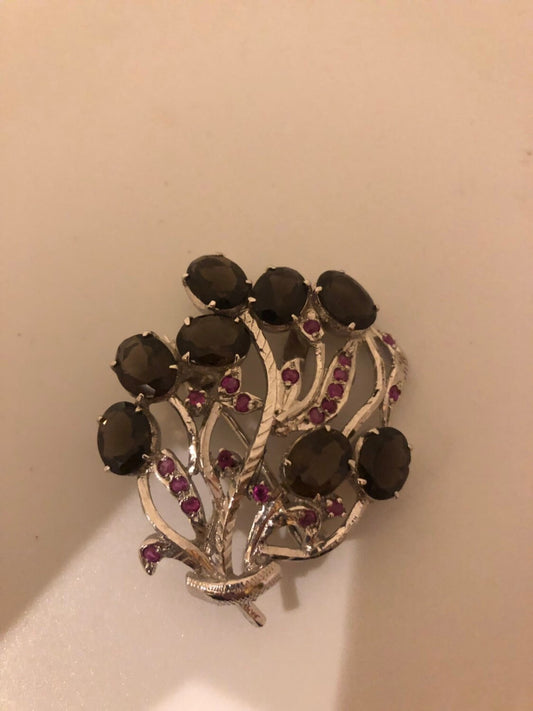 Vintage Handmade Smoky Topaz and Genuine Ruby 925 Sterling Silver Rhodium Brooch Necklace