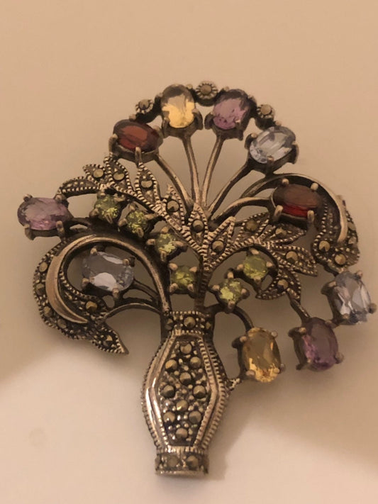 Vintage Handmade Genuine Gemstone Marcasite 925 Sterling Silver Brooch