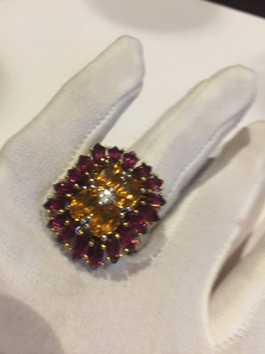 Vintage Bohemian Garnet Citrine 925 Sterling Silver Rhodium Finish Ring