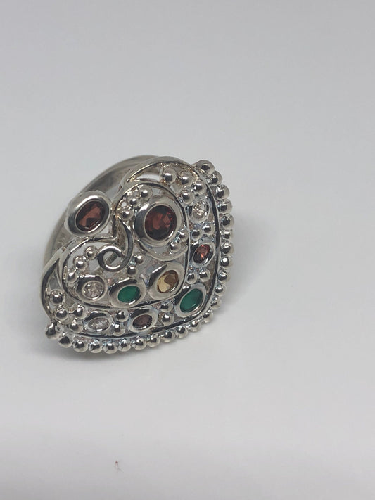Vintage Bohemian Garnet Citrine Peridot Heart 925 Sterling Silver Cocktail Ring
