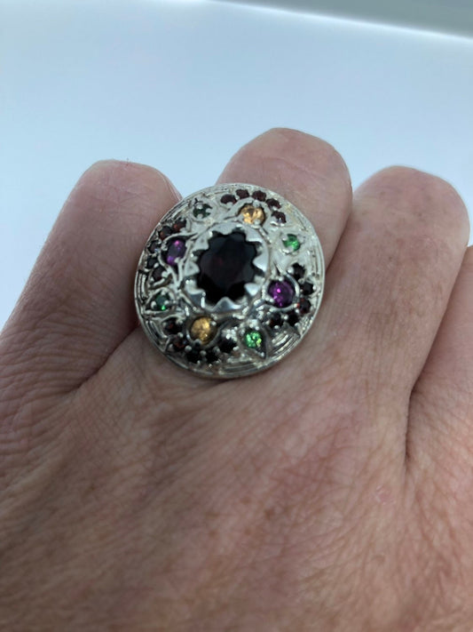 Vintage Bohemian Garnet Citrine Emerald White Sapphire 925 Sterling Silver Ring