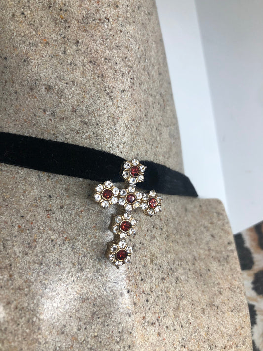 Vintage Bohemian Garnet Cross Choker 925 Sterling Silver Pendant Necklace
