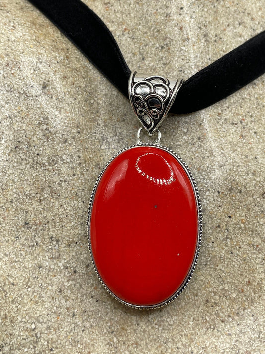 Vintage Boho Silver Red Coral Choker Necklace Black Velvet Choker