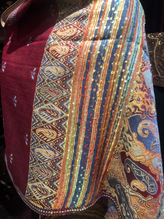 Vintage Burgundy Red Blue Paisley Brocade Pashmina Scarf Wrap