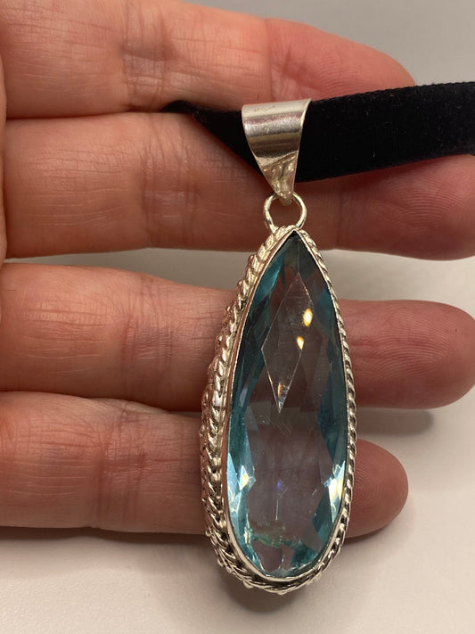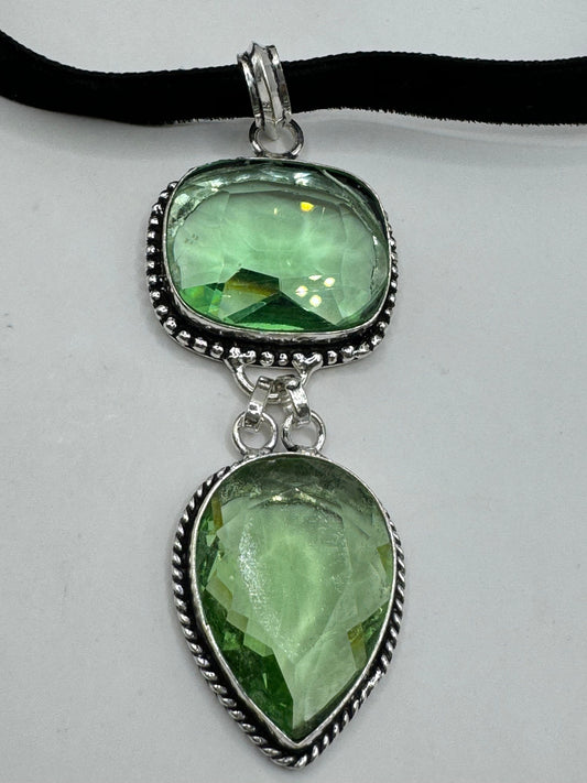 Antique Aqua Blue Volcanic Glass Boho Choker Black Velvet Ribbon Necklace