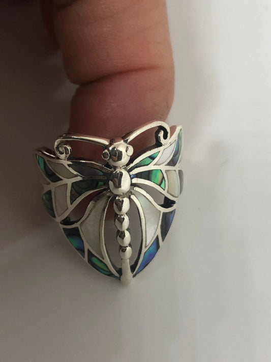 Antique Deco Mother of Pearl Abalone Dragonfly Filigree Sterling Silver Ring