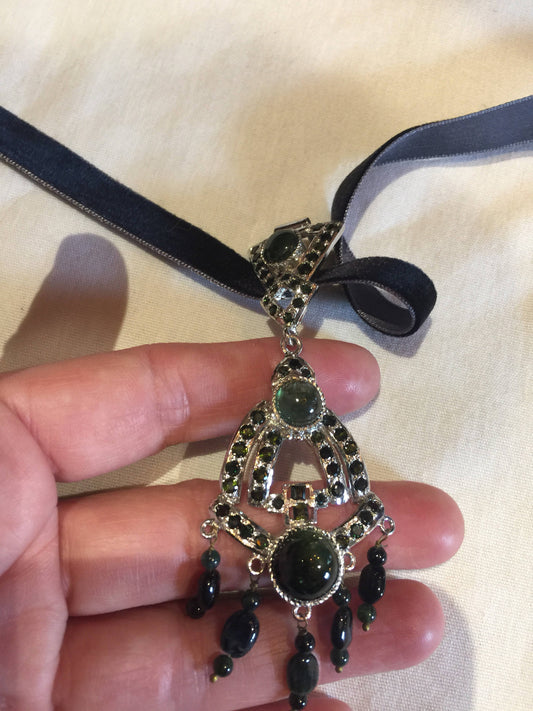 Vintage Handmade Genuine Green Toumaline 925 Sterling Silver Rhodium Deco Pendant