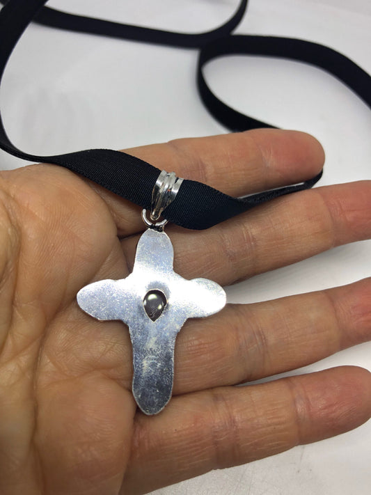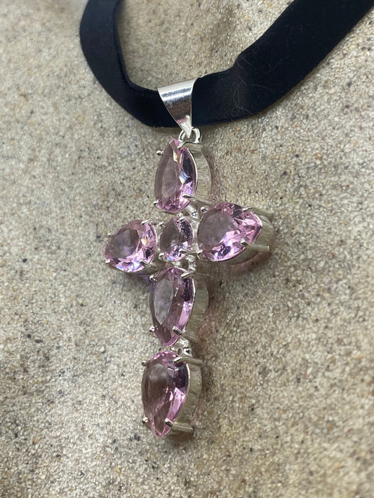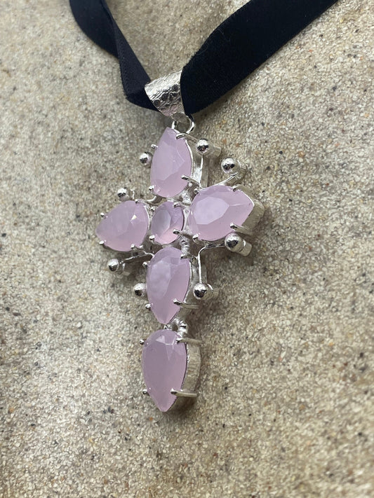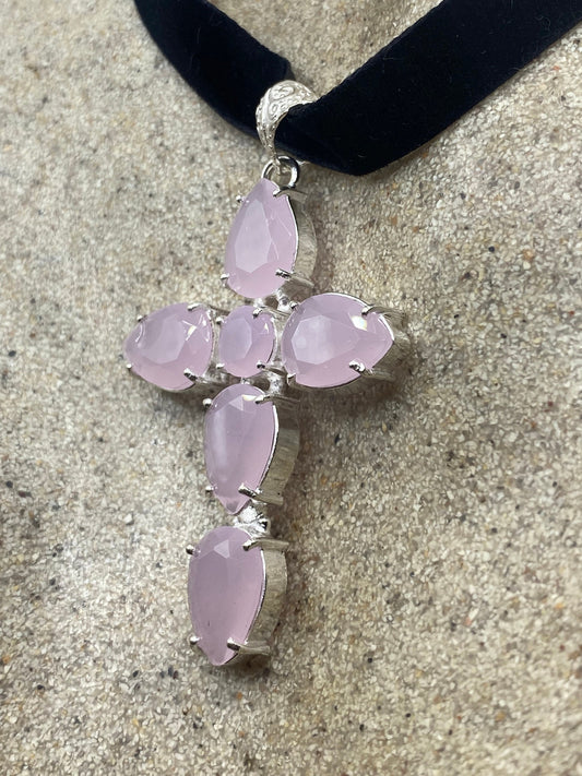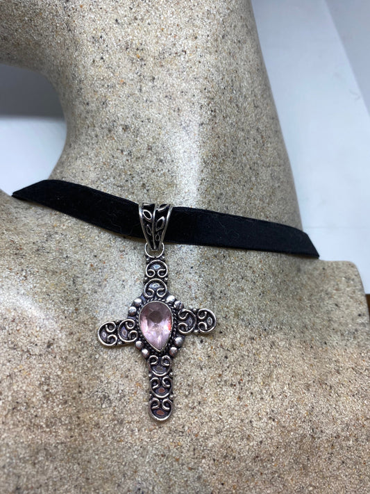 Vintage Handmade Silver Finish Rose Quartz Cross Choker Pendant