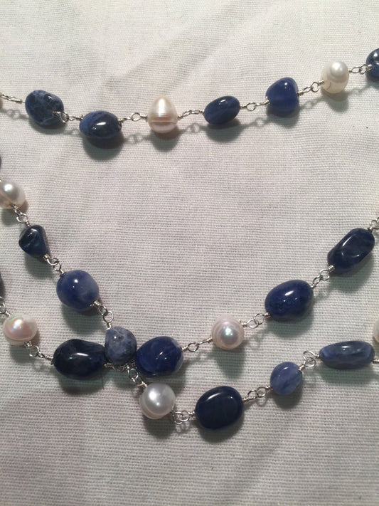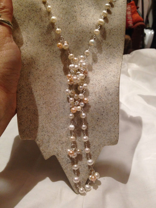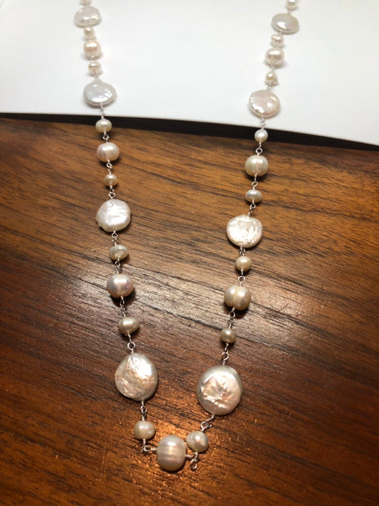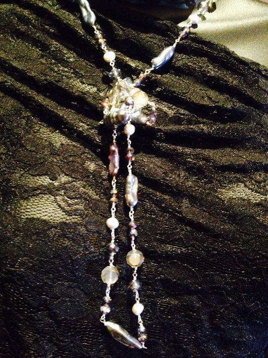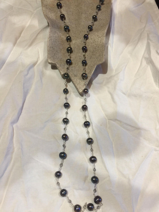 Hand Wrapped grey Pearl and Crystal Long Necklace
