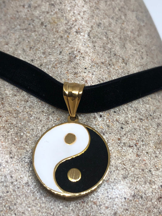 Vintage Yin Yang Gold Stainless Steel Gothic Pendant Necklace Velvet Ribbon Choker
