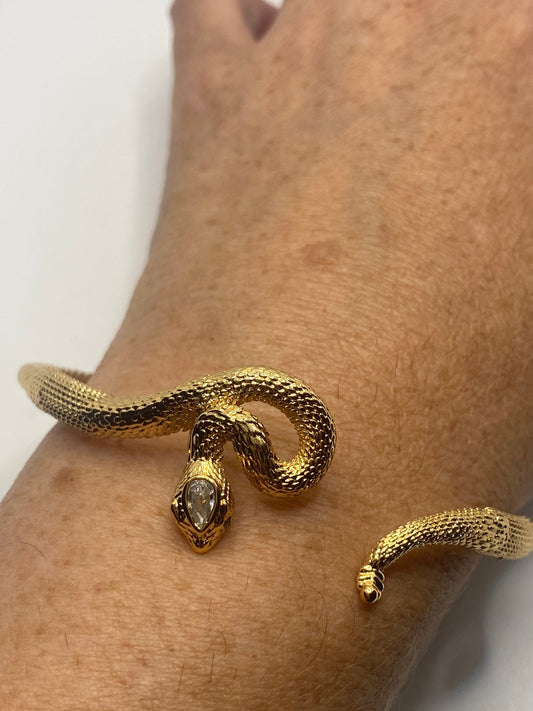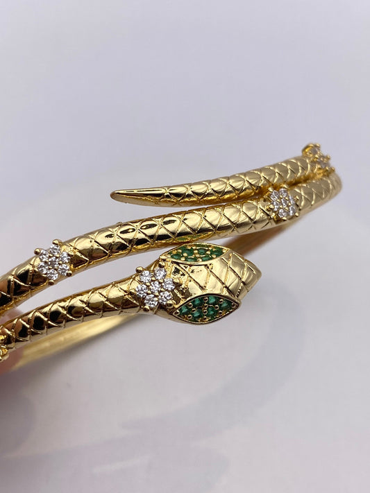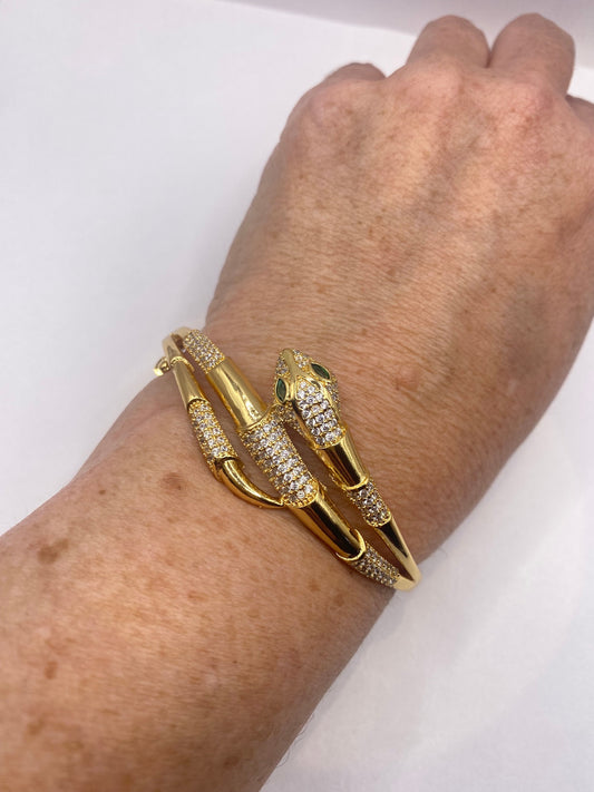 Vintage Snake Bangle Bracelet Gold filled Green Crystal Eyes