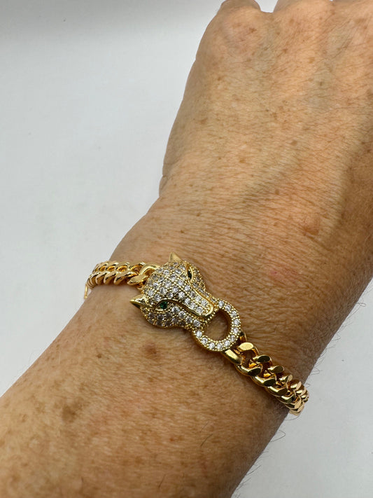 Vintage Cougar Cat Bracelet Gold filled Green Crystal Eyes