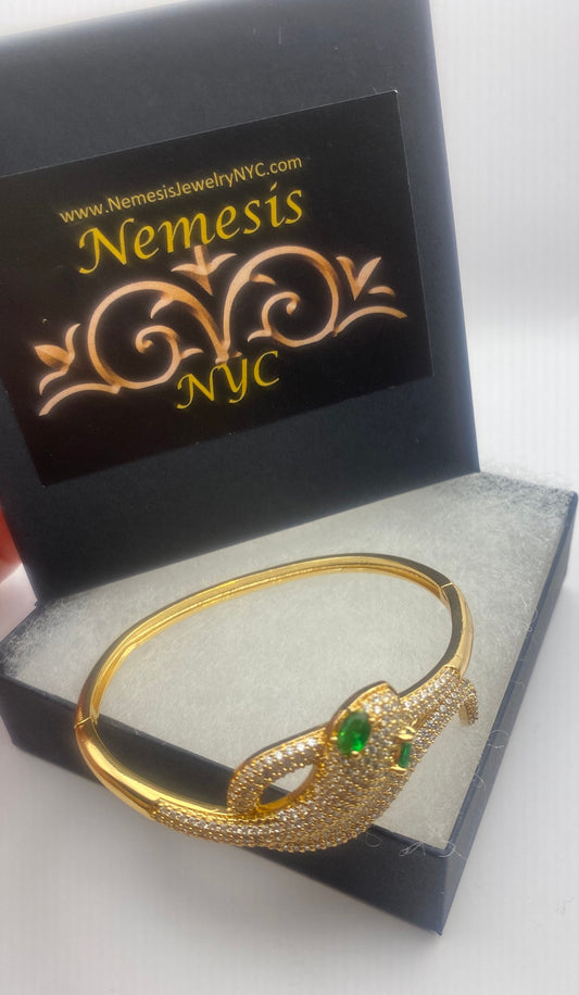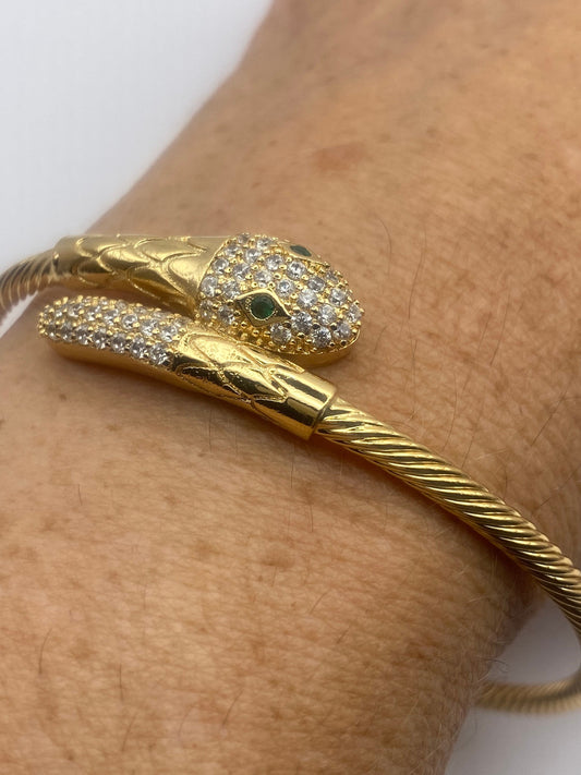 Vintage Snake Bangle Bracelet Gold filled Green Crystal Eyes