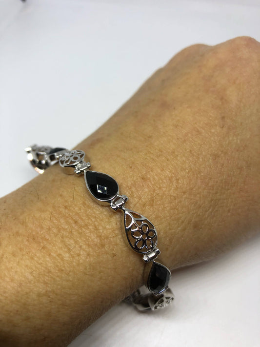 Vintage Hand Made 925% Sterling Silver Crystal Filligree Black Jet Faceted Onyx Bracelet