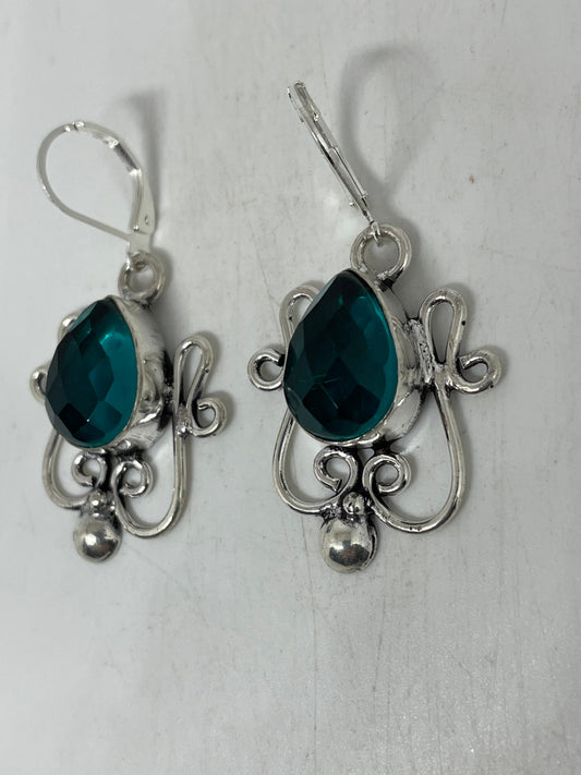 Antique Vintage Aqua Blue Volcanic Glass Silver Dangle Earrings