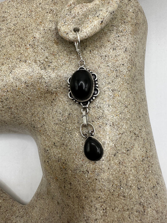 Antique Vintage Black Onyx 925 Silver Dangle LeverBack Earrings