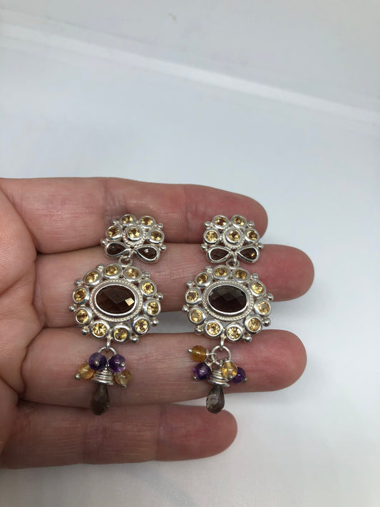 Vintage Mixed Genuine Citrine Gemstone Filigree 925 Sterling Silver Dangle button Earrings