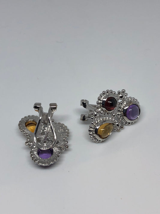 Vintage Mixed Genuine Gemstone Filigree 925 Sterling Silver Dangle button Earrings