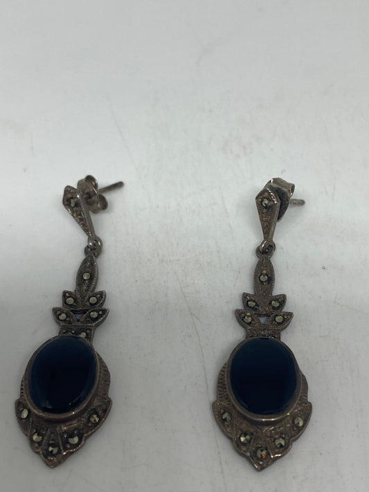 Vintage Black Onyx Earrings Marcasite 925 Sterling Silver Deco Dangle Chandelier