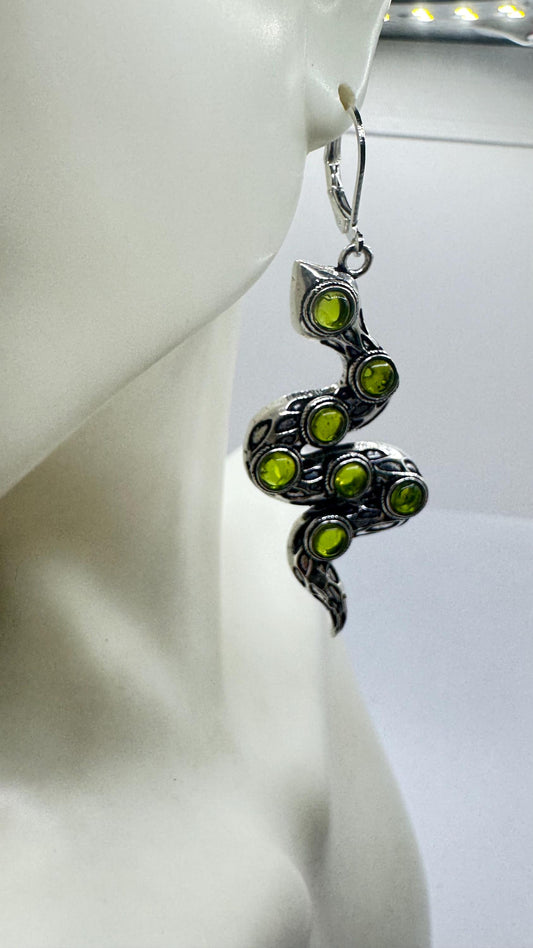 Vintage Genuine Green Peridot Sterling Silver Snake Serpent Dangle Chandelier Earrings