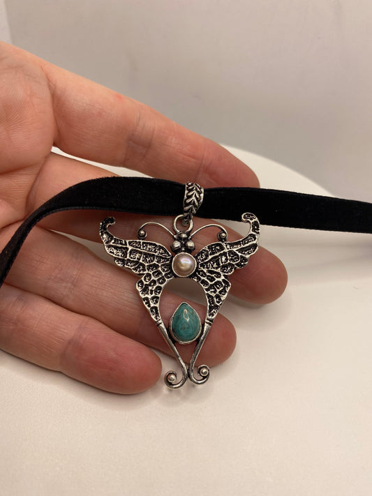 Vintage Lunar Moth Choker Blue Turquoise and Pink Pearl Necklace