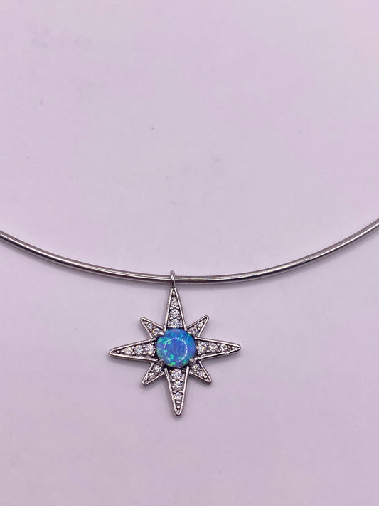 Vintage Blue Opal Star Choker 925 Sterling Silver Hoop Necklace