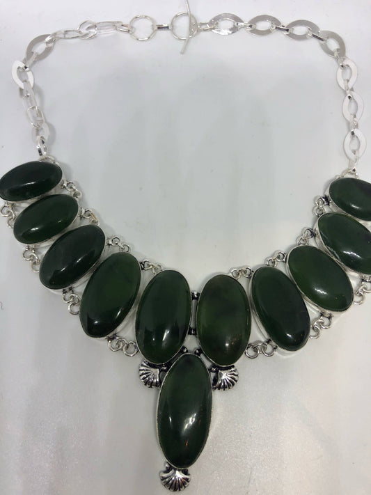 Vintage Silver Genuine Green Nephrite Jade Gemstone Necklace.